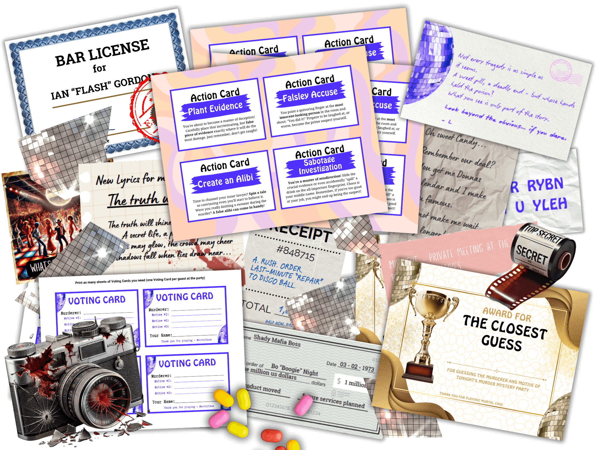 And ofcourse! There is no murder mystery party without evidence and fun game boosters.