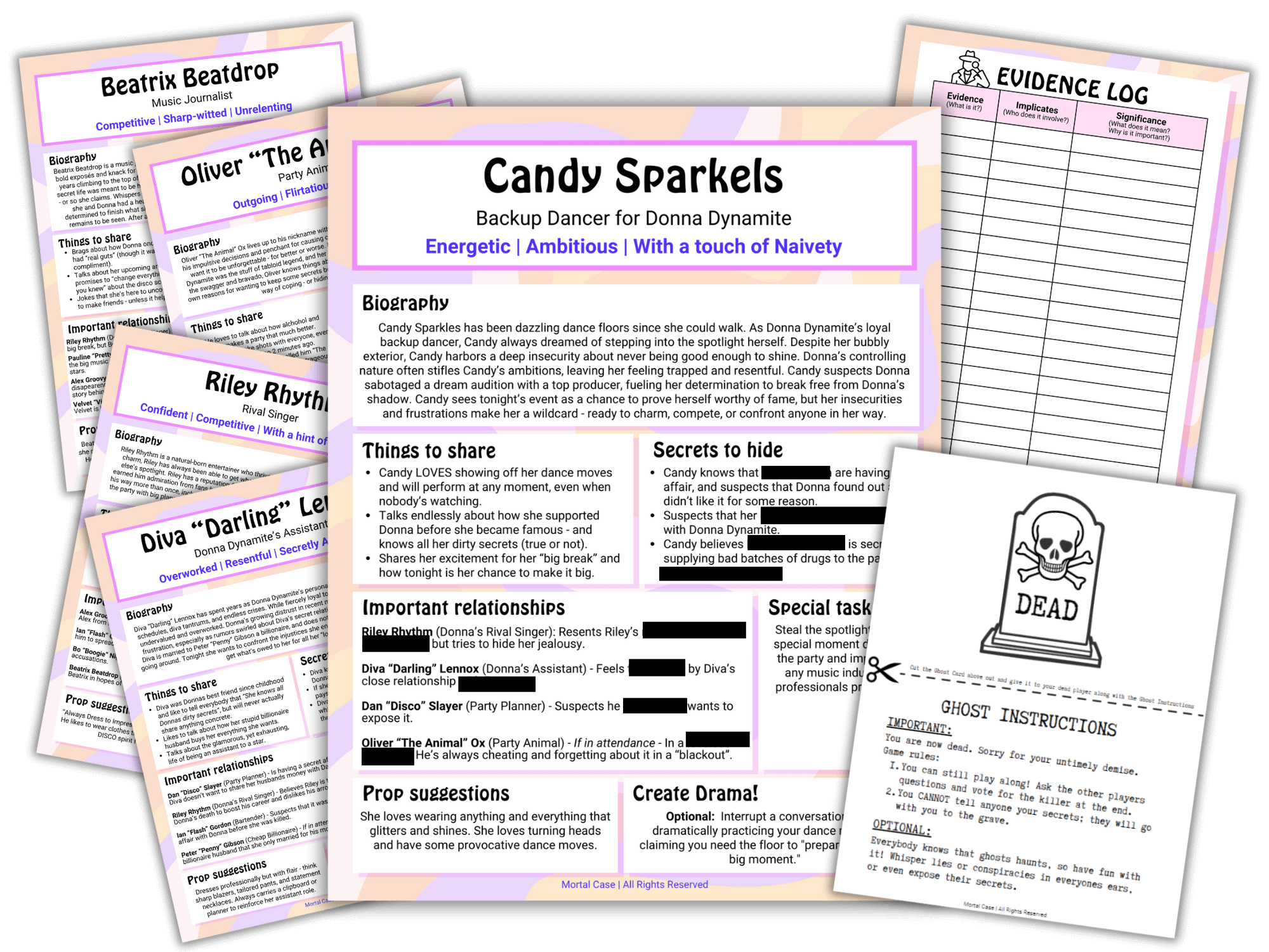 The game is a Freeplay (mingle-style) murder mystery, which means each guest is assigned a unique character. You’ll send out a Character Guide to every player, filled with secrets, objectives, and relationships that drive the drama.