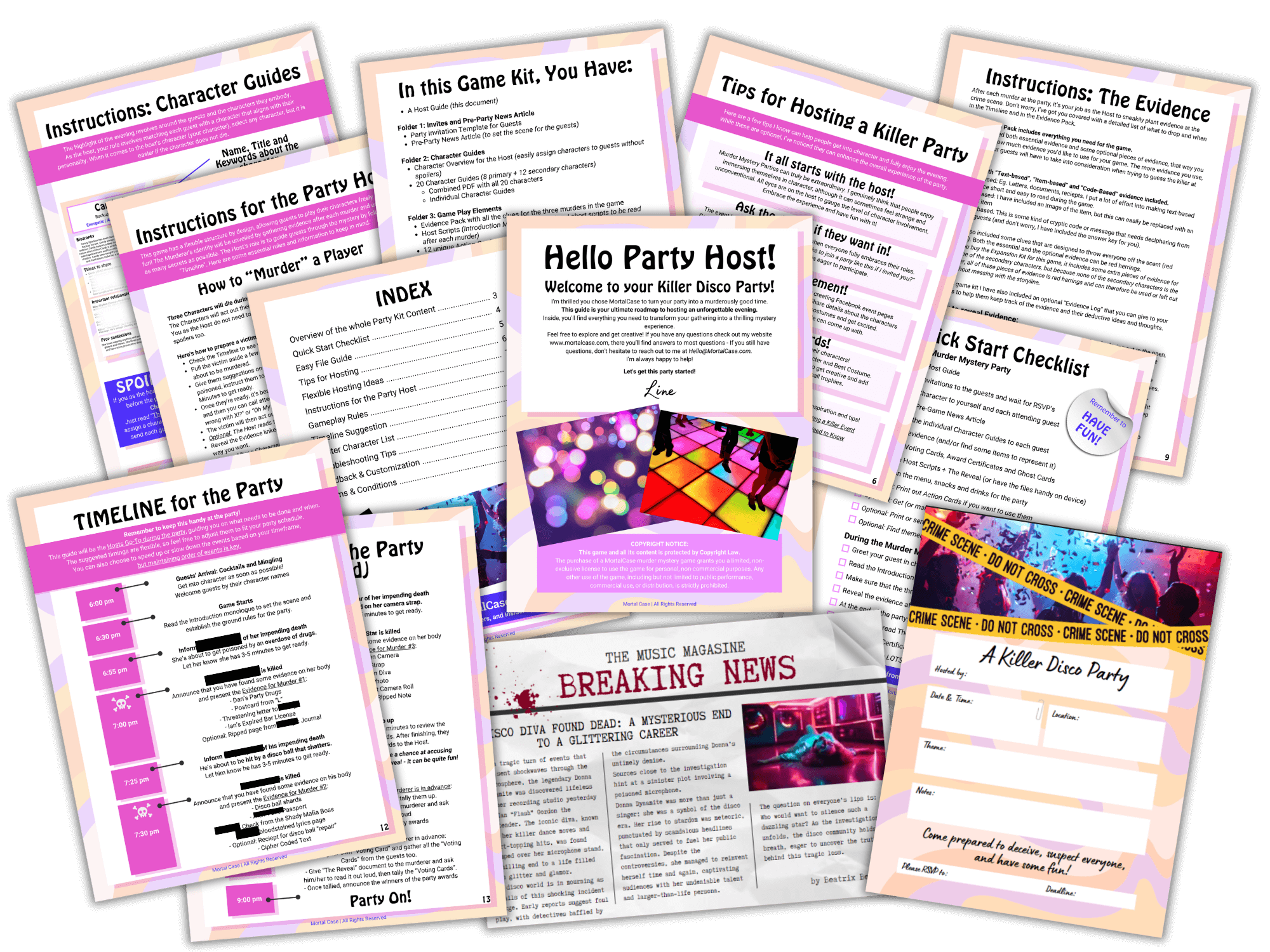 As the host, you don’t need to memorize anything or stay behind the scenes. My easy-to-follow Host Guide walks you through everything step by step. And yes – you can absolutely play along without knowing who the killer is (or peek at the included spoilers if that’s your jam). The killer is a secret to everyone – even the killer themselves – for a truly immersive, spoiler-free experience.