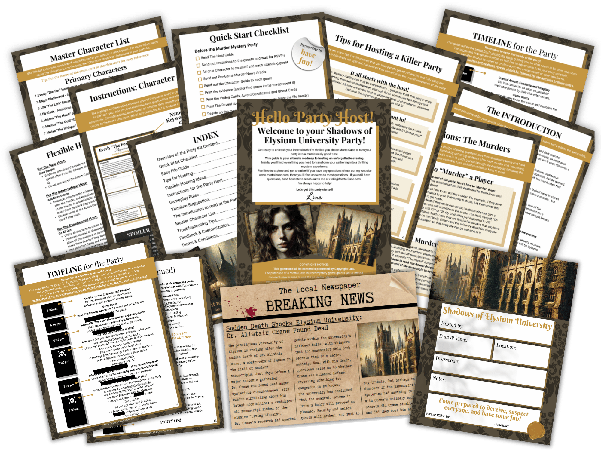 This dark academic, highly interactive murder mystery party game is an evidence-based, multiple murder mingling experience for 10–20 players that you can host right at home!
